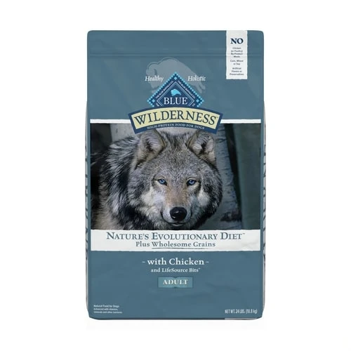 BLUE Wilderness natural dry dog food satisfies the spirit of the wolf in your canine with more of the meat dogs love. This high protein, grain free formula starts with delicious, protein-rich chicken, features antioxidant-rich LifeSource Bits and is enhanced with vitamins, minerals and other nutrients. Specially formulated for adult dogs, the high-quality protein plus complex carbohydrates from fruits and vegetables help support your dog’s energy needs.