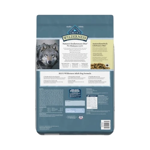 BLUE Wilderness natural dry dog food satisfies the spirit of the wolf in your canine with more of the meat dogs love. This high protein, grain free formula starts with delicious, protein-rich chicken, features antioxidant-rich LifeSource Bits and is enhanced with vitamins, minerals and other nutrients. Specially formulated for adult dogs, the high-quality protein plus complex carbohydrates from fruits and vegetables help support your dog’s energy needs.