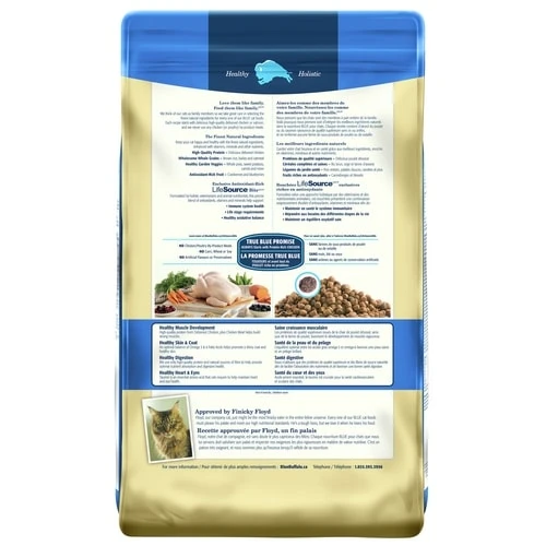 BLUE for Cats dry cat food recipes are made with the finest natural ingredients enhanced with vitamins and minerals. Starting with real meat as the 1st ingredient, they include wholesome grains, veggies and fruit, plus our exclusive, antioxidant-rich LifeSource Bits® to support your feline’s overall health and well-being. BLUE for Cats has formulations to meet all of your cat’s life stage and lifestyle needs, from hairball and weight control to sensitive stomach and healthy aging recipes. BLUE for Cats is a product of the Blue Buffalo company. Based in the United States, Blue Buffalo makes premium-quality pet foods.