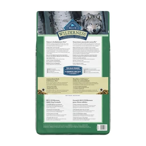 BLUE Wilderness natural dry dog food satisfies the spirit of the wolf in your canine with more of the meat dogs love. This high protein, grain free formula starts with delicious, protein-rich duck, features antioxidant-rich LifeSource Bits and is enhanced with vitamins, minerals and other nutrients. Specially formulated for adult dogs, the high-quality protein plus complex carbohydrates from fruits and vegetables help support your dog’s energy needs.