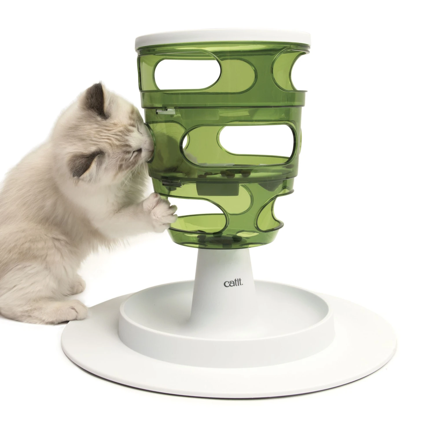 The Catit Senses 2.0 Food Tree is the feeding solution for cats that tend to eat quickly. Cats are required to move the kibble or treats from the top to the bottom of the tree by pawing at it through the side openings.