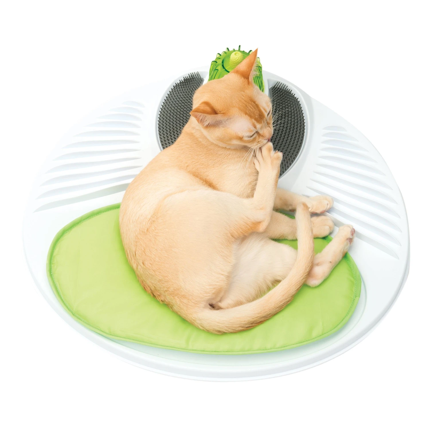 The Catit Senses 2.0 Wellness Center contains a gum stimulator (refills available, sold separately 43158), dried catnip, 2 grooming combs, an ergonomic base with massage ridges, a broad cushion, a multi-purpose massager and an anti-skid ring.
