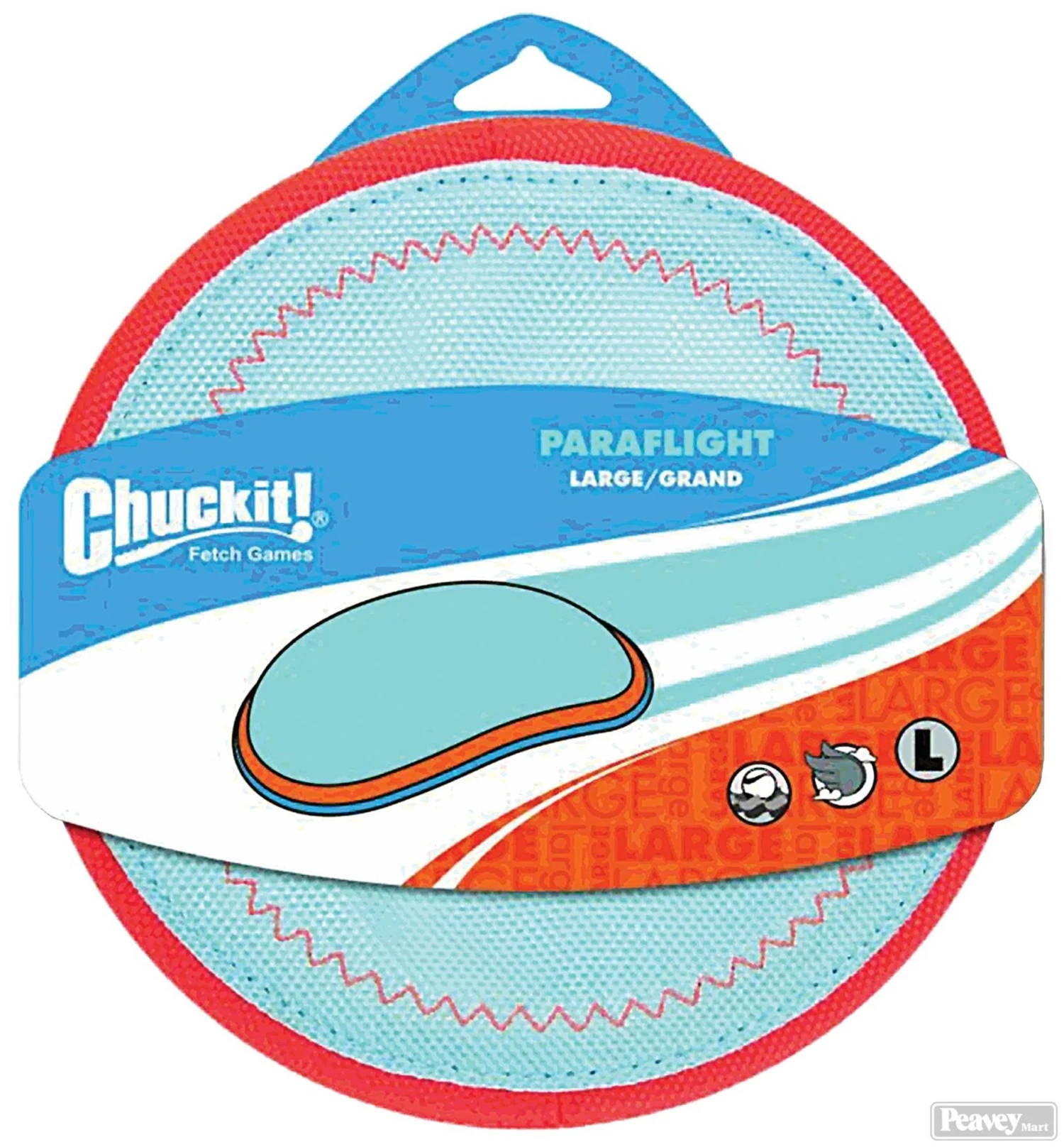 The Chuckit!® Paraflight® Flyer is perfect for games of fetch! Whether you’re out in the yard or in water! The Paraflight Flyer features a soft rubber edge that’s gentle on your dog’s gums and teeth; but a strong multilayer nylon interior makes it durable for playtime. Bright colors give it increased visibility and help to prevent the flyer from getting lost. The aerodynamic shape is perfect for long distance games of fetch. Soars through the air and descends gradually; which allows your dog plenty of opportunities to run and jump after it. Floats in the water for even more fun. Available in large or small sizes.PRODUCT NOTE: For supervised play only. Choose the appropriate size and type of toy to prevent choking or other harm. Inspect this toy regularly; if the toy is damaged or if parts become separated; remove toy and parts as injury may result. Not a child’s toy.