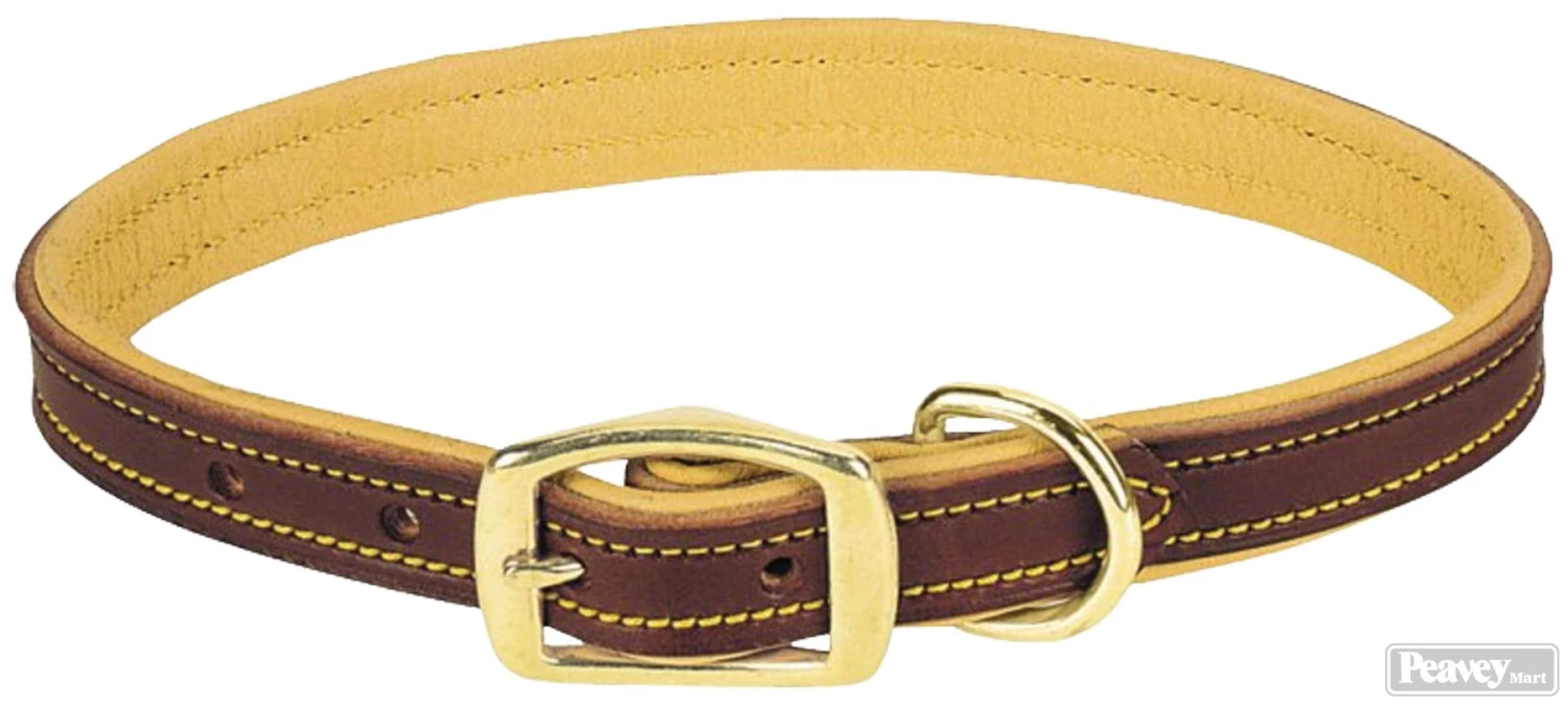 Constructed of single-ply sunset harness leather, this collar is fully lined with soft, supple saddle tan deerskin for your dog’s comfort. Features coordinating stitching, non-rust solid brass buckle and brass plated dee and rivets. Each Weaver collar is measured to the middle hole to give you more flexibility in sizing. Measures 3/4″ X 19″.