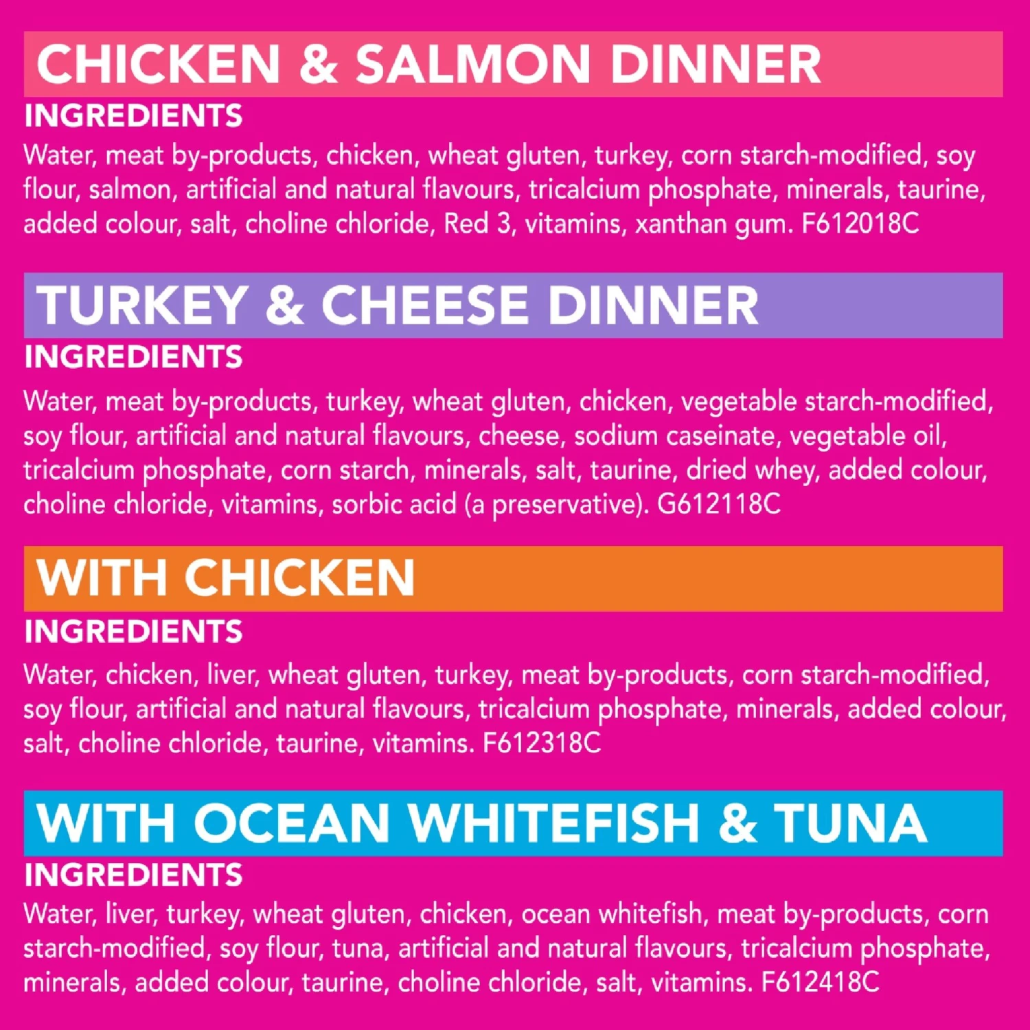 Shreds of turkey, chicken, and salmon, slow-cooked to perfection in gravy. 32 x 156G