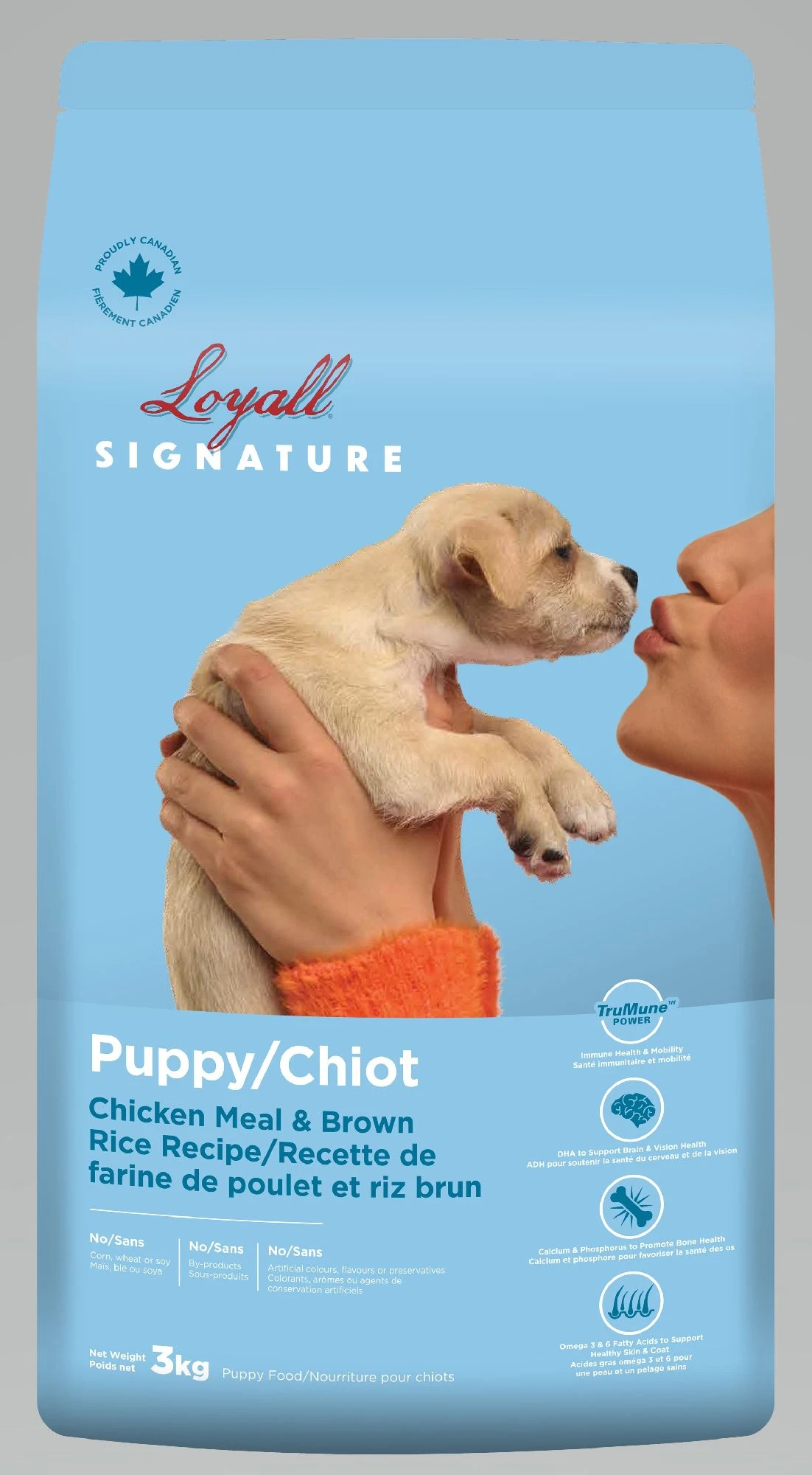 Your healthy puppy can play more bringing joy and making the most remarkable memories with you that will last a lifetime. Loyall® Signature Puppy Chicken & Brown Rice Recipe features chicken protein as the #1 ingredient for a high-quality protein diet along with a variety of fruits and vegetables. As a wholesome option, it’s always free of corn, wheat, soy, and by-products for high-quality nutrition for puppies. Added DHA helps support brain and vision health, while calcium and phosphorus support healthy bone development. It’s always free of corn, wheat, soy, and by-products. With guaranteed levels of Omega 6 and Omega 3 fatty acids, it supports coat and skin health. Our patented Opti-Cook® process and added prebiotics help support digestive health. You can always count on every bag of Loyall® Signature providing Trumune® power to support immune health and mobility. No Corn, Wheat, Soy/ No By-products / No Artificial Colours, Flavours or Preservatives. DHA to support brain and vision health. Calcium and Phosphorus to promote bone health. Omega 6 & 3 Fatty Acids to support healthy skin & coat. Protein – Quality chicken protein is the #1 ingredient for strong muscle development. Carbohydrates – Digestible Carbohydrates like brown rice and oatmeal for energy. Fruits & Vegetables – Fruits & Vegetables provide fibre and antioxidants for immunity. Trumune® Powers the potential of the immune system – Trumune® Power is a postbiotic found in Loyall® pet foods that is scientifically proven to enhance gut health, immunity, and mobility. Opti-Cook® Promotes Optimal Digestion – Our patented Opti-Cook® process ensures consistent quality in every batch so nutrients are easily digested and starches are processed properly.