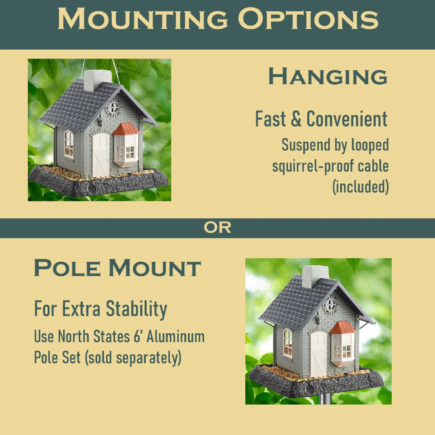 - It can be mounted from a pole or hung on a tree branch or hook.