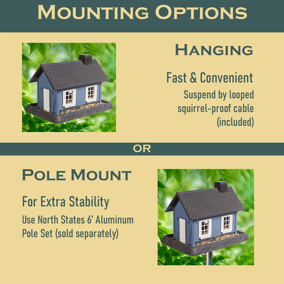 The Blue Cottage birdfeeder is part of an extensive Village Collection of feeders. This charming country cottage feeder has blue siding and a gray roof. Measuring 10.25 x 14.5 x 11 inches high, this feeder holds 8 lbs. of seed. Its windows are framed with clear plastic panes to monitor seed levels. The roof contains a lift-off chimney to make filling this feeder a breeze. The large tray/perch is removable for easy clean out. This versatile feeder can either be used as a hanging birdfeeder or pole mounted and offers a three year warranty. Made from durable molded plastic, this feeder will last for years to come and brighten any backyard.