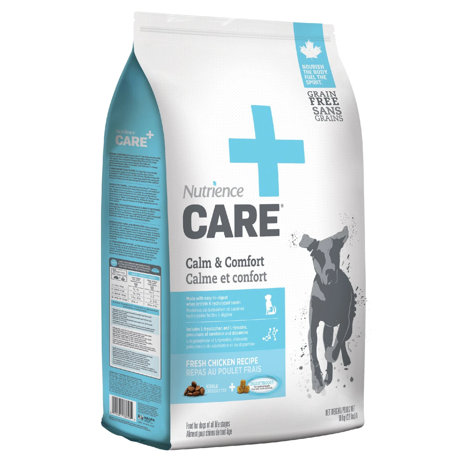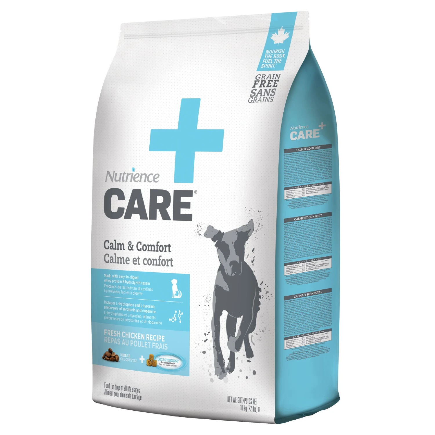 Nutrience Care Dog Calm & Comfort is formulated with moderate amounts of protein, including easy-to-digest whey protein and hydrolyzed casein to reduce overall body stimulation. L-tryptophan: an amino acid required for serotonin production (important in regulating mood, social behavior, digestion, ect.) and L-tyrosine: an amino acid required to make dopamine (a neurotransmitter associated with reward-motivated behavior and motor control).