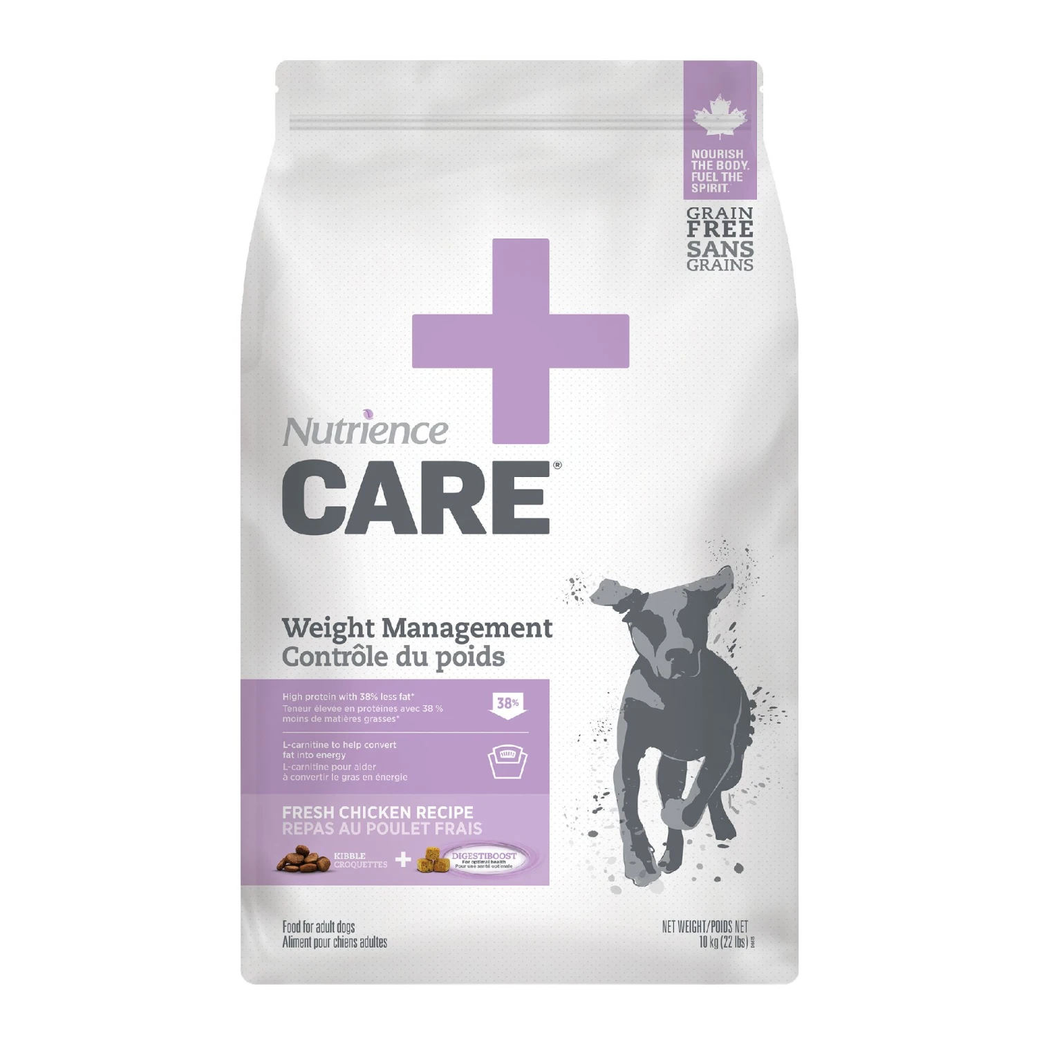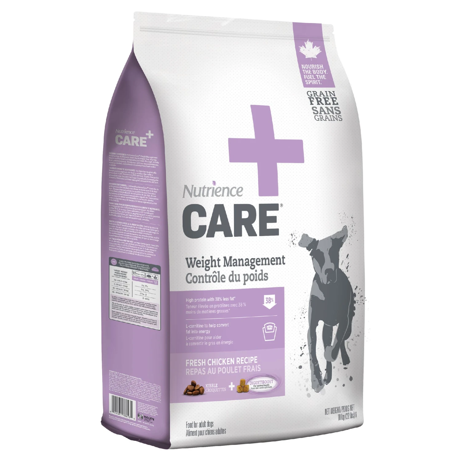 Nutrience Care Weight Management is a low fat formula to help limit weight gain: 50% less in cat and 38% less in dog vs our regular Grain-Free formulas.
