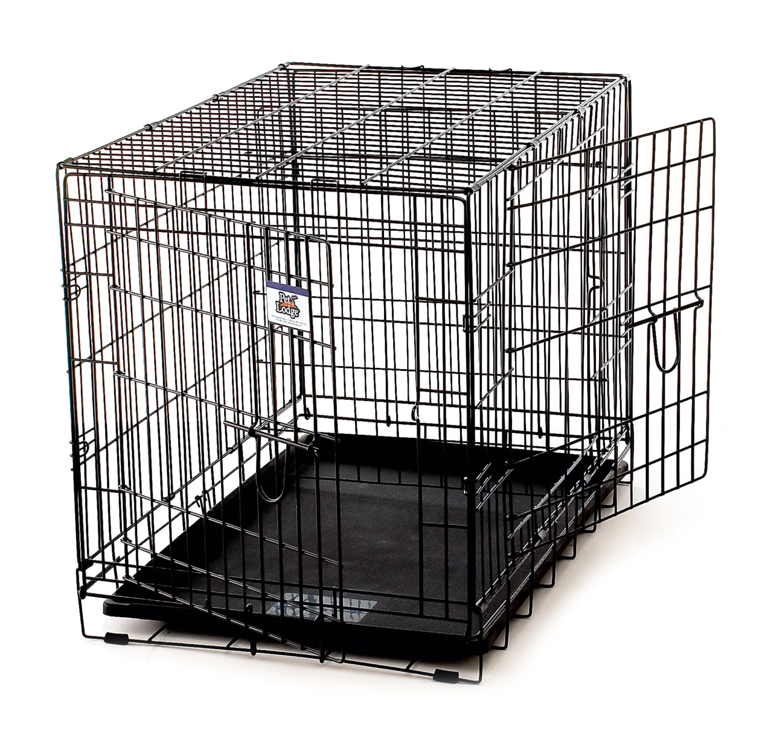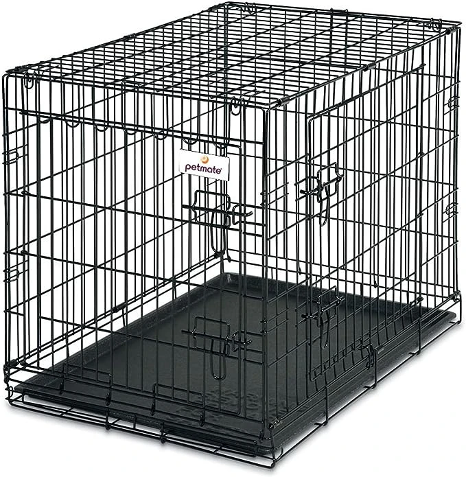 The Petmate 2 doors kennel has a double latch, single front door that helps with control, security, easy access and versatile positioning. Comes with a top handle and a divider that will help utilize training your dog from a puppy to fully grown. Sturdy wire construction, a rust resistant black coating and a leak proof removable pan. This size of kennel is recommended for small to medium sized dogs.