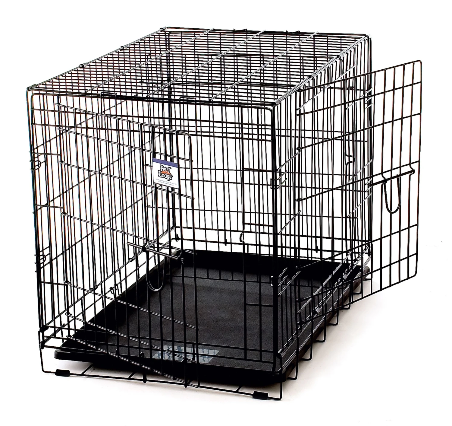 The Petmate 2 doors kennel has a double latch, single front door that helps with control, security, easy access and versatile positioning. Comes with a top handle and a divider that will help utilize training your dog from a puppy to fully grown. Sturdy wire construction, a rust resistant black coating and a leak proof removable pan. This size of kennel is recommended for medium sized dogs.