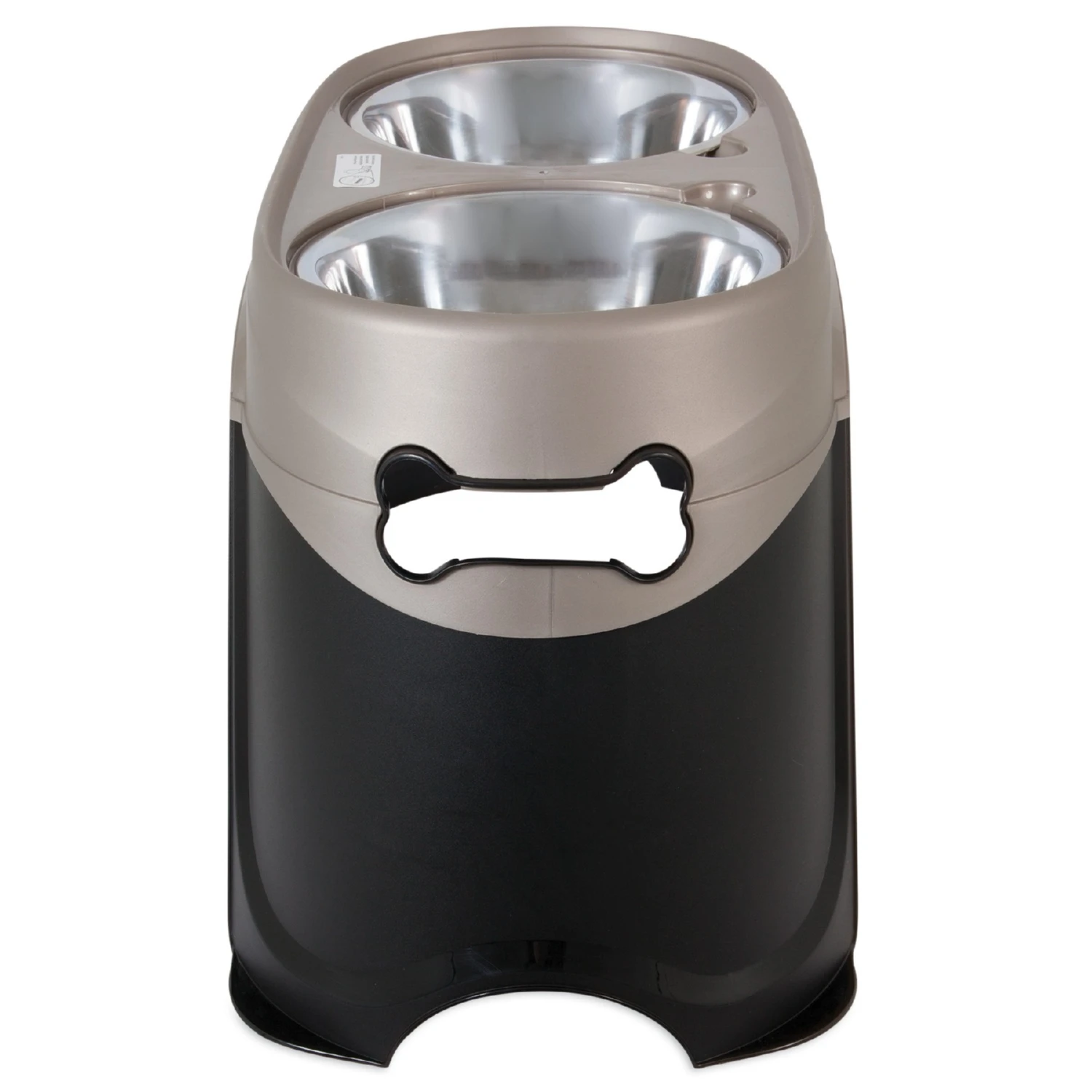 Meet dogs at their level with the Petmate® Easy Reach Diner® elevated feeder and waterer! Any dog will benefit from the improved digestion that comes from eating in a comfortable position; and older dogs will appreciate how easy it is on their joints. Prevents the stooping and discomfort associated with bending down to eat or drink. Helps to Improves your pet posture and digestion No more bowl rattling; thanks to rubber inserts that reduce noise and keep bowls in place. Easy-to-grip bone-shaped cutouts on the side lend practical style; giving pet parents handles for easy lifting. The removable stainless steel dishwasher safe bowls make the Easy Reach Diner easy to clean. Elevated; spill-free rims help to keep water and food where they belong. Ideal for taller dogs and large breed dogs.