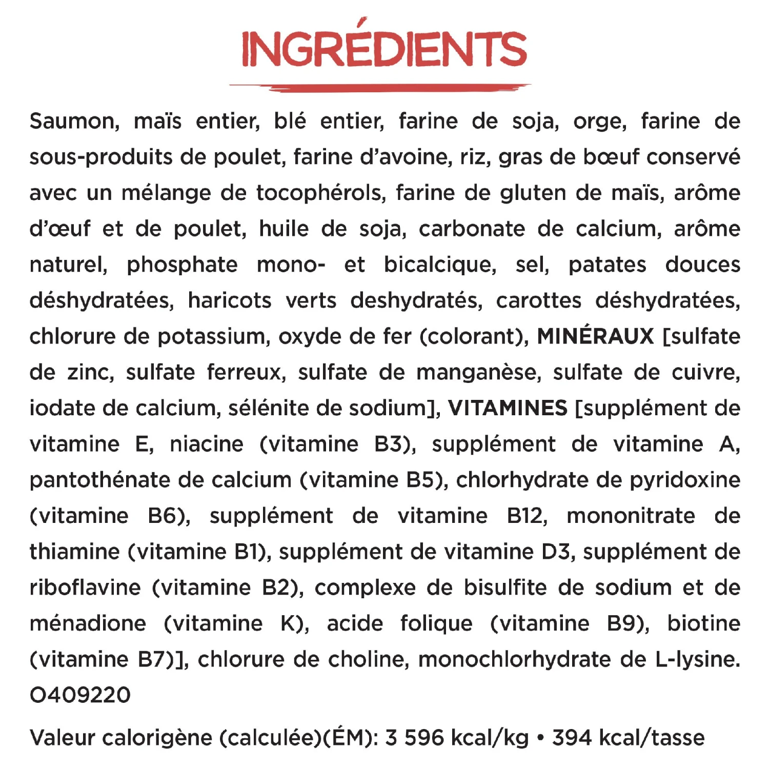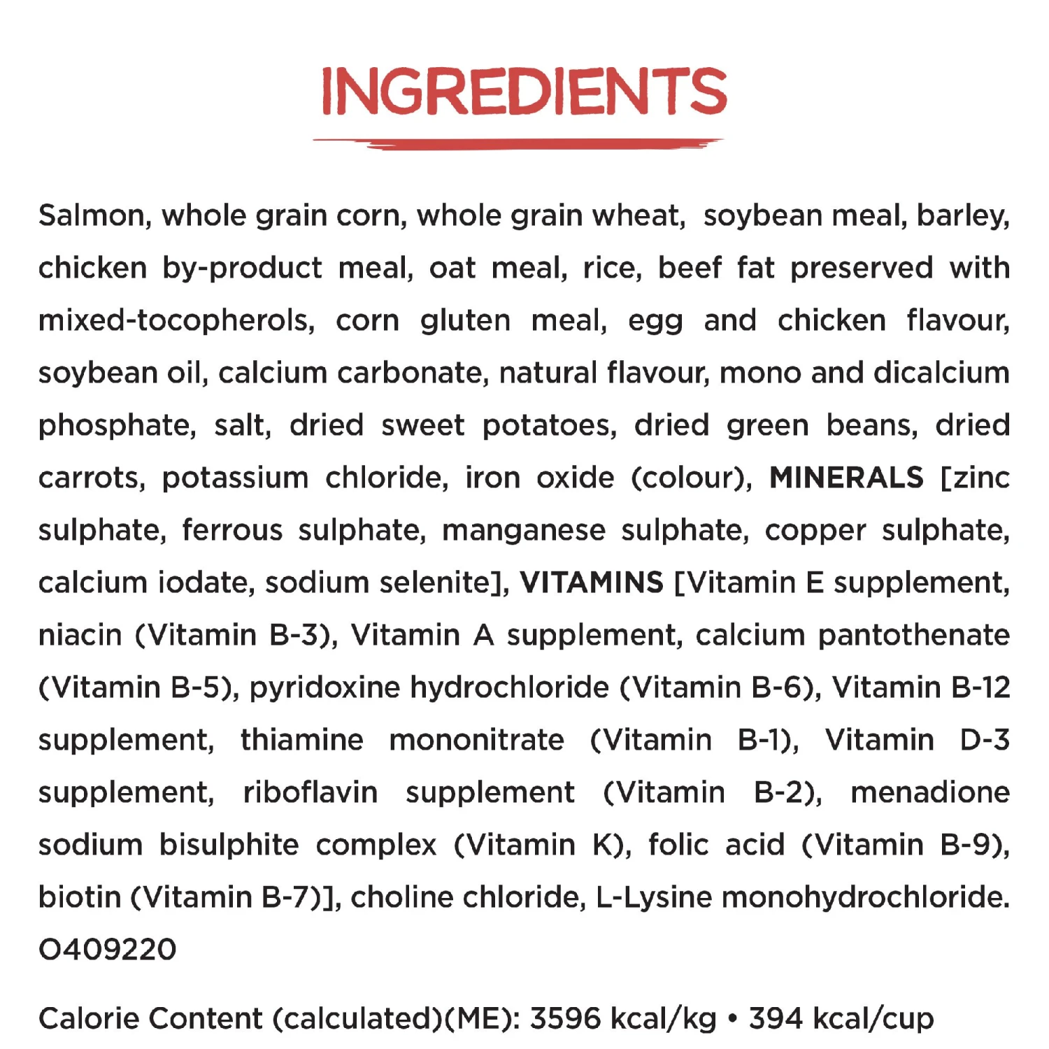 Good food starts with good ingredients. That’s what you’ll find at the heart of our Originals With Real Salmon recipe. Salmon, whole grain corn, whole grain wheat, soybean meal, barley, chicken by-product mean, oat meal, rice, beef fat preserved with mixed-tocopherols, corn gluten mean, egg and chicken flavour, soybean oil, calcium carbonate, natural flavour, mono and dicalcium phosphate, salt, dried sweet potatoes, dried green beans, dried carrots, potassium chloride, iron oxide (colour).