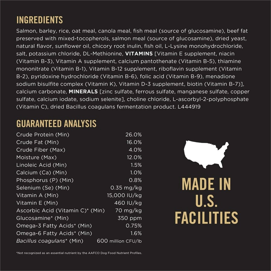Salmon, Barley, Rice, Oat Meal, Canola Meal, Fish Meal (Source of Glucosamine), Beef Fat Preserved with Mixed-Tocopherols, Salmon Meal (Source of Glucosamine), Dried Yeast, Natural Flavor, Sunflower Oil, Chicory Root Inulin, Fish Oil, L-Lysine Monohydrochloride, Salt, Potassium Chloride, DL-Methionine, Vitamins [Vitamin E Supplement, Niacin (Vitamin B-3), Vitamin A Supplement, Calcium Pantothenate (Vitamin B-5), Thiamine Mononitrate (Vitamin B-1), Vitamin B-12 Supplement, Riboflavin Supplement (Vitamin B-2), Pyridoxine Hydrochloride (Vitamin B-6), Folic Acid (Vitamin B-9), Menadione Sodium Bisulfite Complex (Vitamin K), Vitamin D-3 Supplement, Biotin (Vitamin B-7)], Calcium Carbonate, Minerals [Zinc Sulfate, Ferrous Sulfate, Manganese Sulfate, Copper Sulfate, Calcium Iodate, Sodium Selenite], Choline Chloride, L-Ascorbyl-2-Polyphosphate (Vitamin C), Dried Bacillus Coagulans Fermentation Product.
