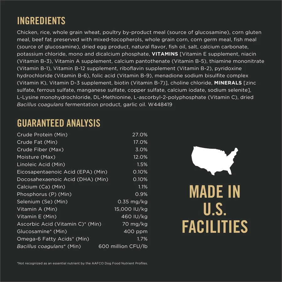 Chicken, Rice, Whole Grain Wheat, Poultry By-Product Meal (Source of Glucosamine), Corn Gluten Meal, Beef Fat Preserved with Mixed-Tocopherols, Whole Grain Corn, Corn Germ Meal, Fish Meal (Source of Glucosamine), Dried Egg Product, Natural Flavor, Fish Oil, Salt, Calcium Carbonate, Potassium Chloride, Mono and Dicalcium Phosphate, Vitamins [Vitamin E Supplement, Niacin (Vitamin B-3), Vitamin A Supplement, Calcium Pantothenate (Vitamin B-5), Thiamine Mononitrate (Vitamin B-1), Vitamin B-12 Supplement, Riboflavin Supplement (Vitamin B-2), Pyridoxine Hydrochloride (Vitamin B-6), Folic Acid (Vitamin B-9), Menadione Sodium Bisulfite Complex (Vitamin K), Vitamin D-3 Supplement, Biotin (Vitamin B-7)], Choline Chloride, Minerals [Zinc Sulfate, Ferrous Sulfate, Manganese Sulfate, Copper Sulfate, Calcium Iodate, Sodium Selenite], L-Lysine Monohydrochloride, DL-Methionine, L-Ascorbyl-2-Polyphosphate (Vitamin C), Dried Bacillus Coagulans Fermentation Product, Garlic Oil.