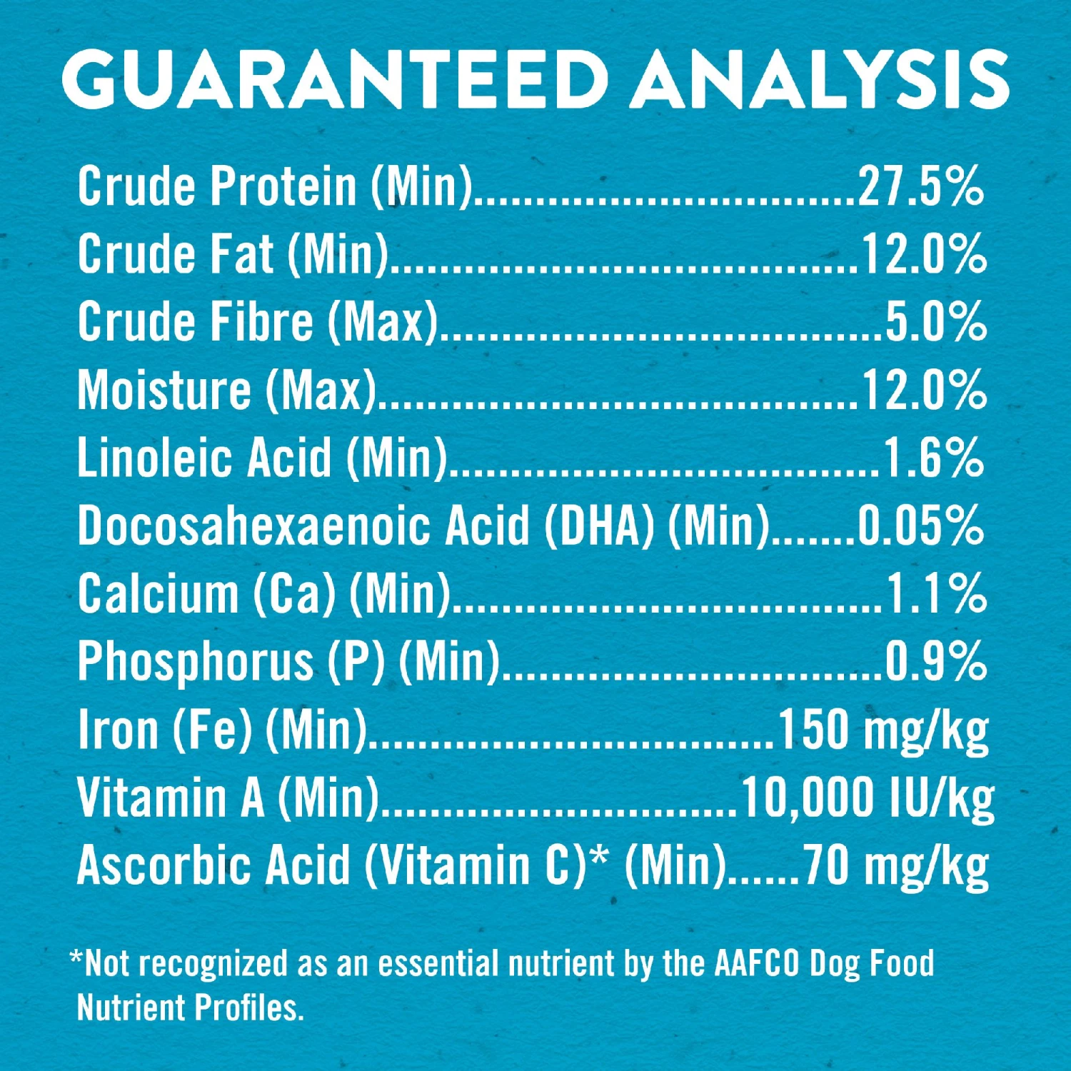 Crude Protein (Min)…27.5%, Crude Fat (Min)…12.0%, Crude Fibre (Max)…5.0%, Moisture (Max)…12.0%, Linoleic Acid (Min)…1.6%, Docosahexaenoic Acid (DHA) (Min)…0.05%, Calcium (Ca) (Min)…1.1%, Phosphorus (P) (Min)…0.9%, Iron (Fe) (Min)…150mg/kg, Vitamin A (Min)…10,000 IU/kg, Ascorbic Acid* (Min)…70mg/kg.