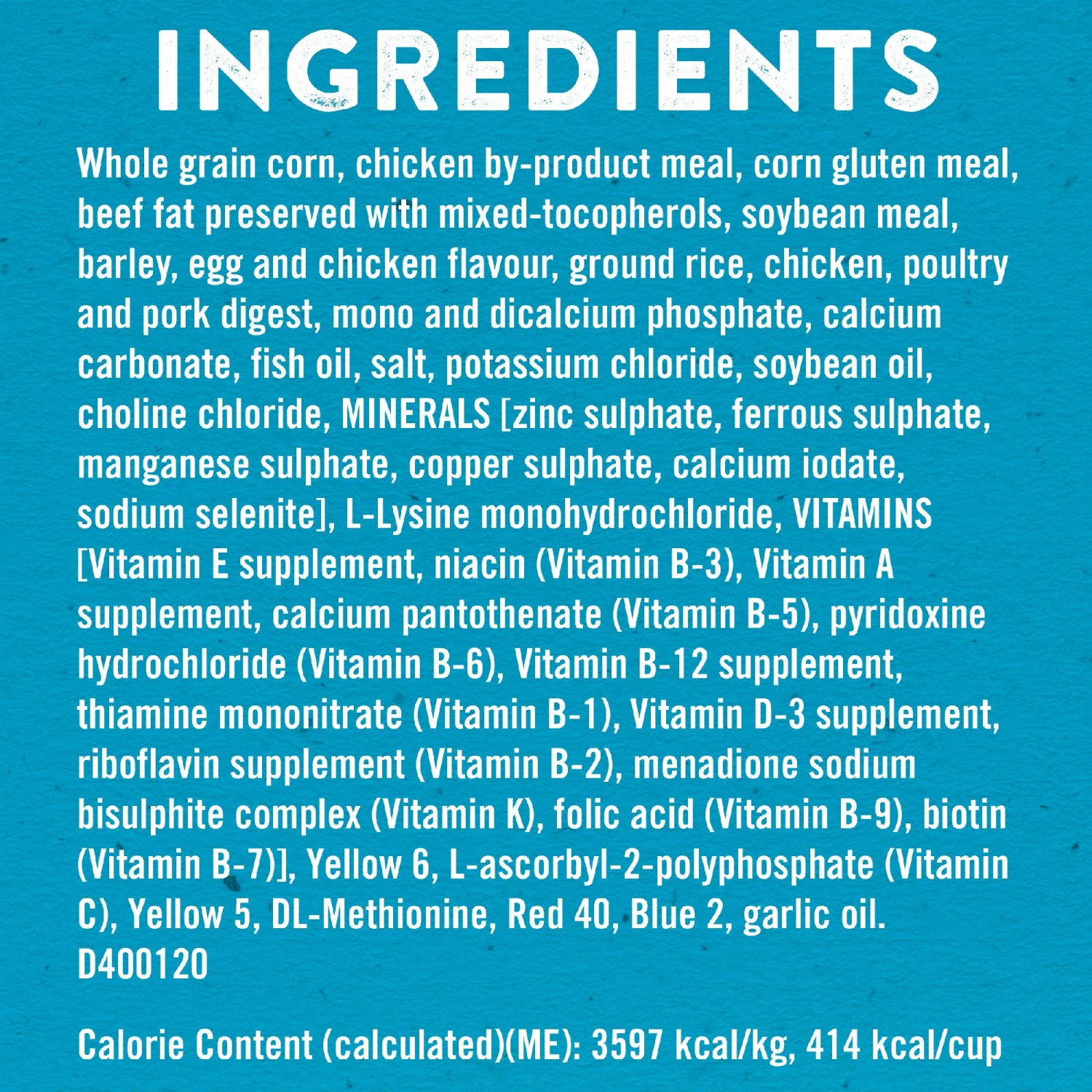 Whole Grain Corn, Chicken By-Product Meal, Corn Gluten Meal, Beef Fat Preserved with Mixed-Tocopherols, Soybean Meal, Barley, Egg and Chicken Flavour, Ground Rice, Chicken, Poultry and Pork Digest, Mono and Dicalcium Phosphate, Calcium Carbonate, Fish Oil, Salt, Potassium Chloride, Soybean Oil, Choline Chloride, Minerals [Zinc Sulphate, Ferrous Sulphate, Manganese Sulphate, Copper Sulphate, Calcium Iodate, Sodium Selenite], L-Lysine Monohydrochloride, Vitamins [Vitamin E Supplement, Niacin (Vitamin B-3), Vitamin A Supplement, Calcium Pantothenate (Vitamin B-5), Pyridoxine Hydrochloride (Vitamin B-6), Vitamin B-12 Supplement, Thiamine Mononitrate (Vitamin B-1), Vitamin D-3 Supplement, Riboflavin Supplement (Vitamin B-2), Menadione Sodium Bisulphite Complex (Vitamin K), Folic Acid (Vitamin B-9), Biotin (Vitamin B-7)], Yellow 6, L-Ascorbyl-2-Polyphosphate (Vitamin C), Yellow 5, DL-Methionine, Red 40, Blue 2, Garlic Oil. D400120.00120.