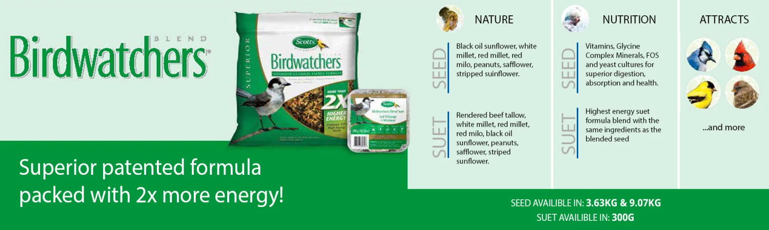Scotts Birdwatchers Blend Jug contains the same great formula as Scotts Birdwatchers Blend but in a convenient jug format. Packed with 2x more energy. Scotts Birdwatchers Blend is a superior blend with a patented formula that is made with the highest energy seeds for wild birds. Great blend for cold weather months.