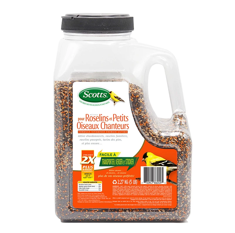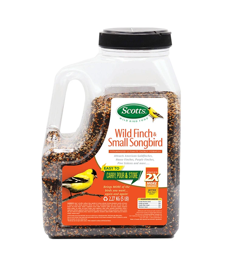 Scotts Wild Finch and Small Songbird Jug contains the same great formula as Scotts Wild Finch & Small Songbird but in a convenient jug format. Attracts 2x more Finches than Nyjer alone. Scotts Wild Finch & Small Songbird Blend is a superior blend with a patented formula that is designed specifically for the food preferences of wild finches and other small songbirds.