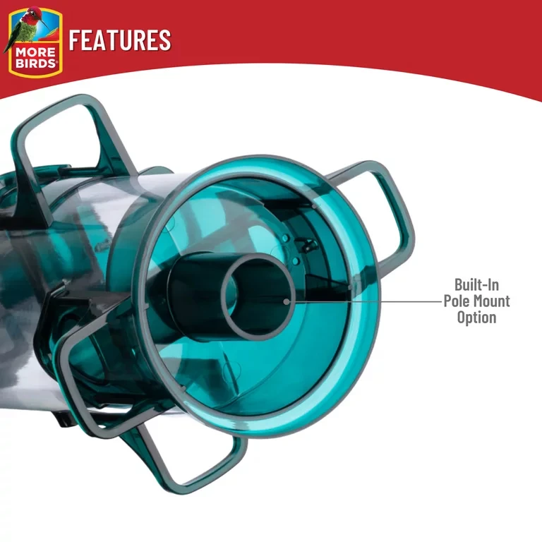 The More Birds Jumbo Seed Tube Feeder is a beautiful jewel-tone bird feeder constructed of durable plastic that protects and contains seed while allowing you to see when the feeder needs to be refilled. Songbirds love its ergonomic U-shaped perches, while 6 strategically placed ports provide feeding space for many birds simultaneously. The -re-attached metal hanger and built in pole socket on the base provide versatile placement options for hanging and pole-mounting. The Jumbo disassembles for convenient cleaning, while its cap slides up teh hanging wire for easy filling.