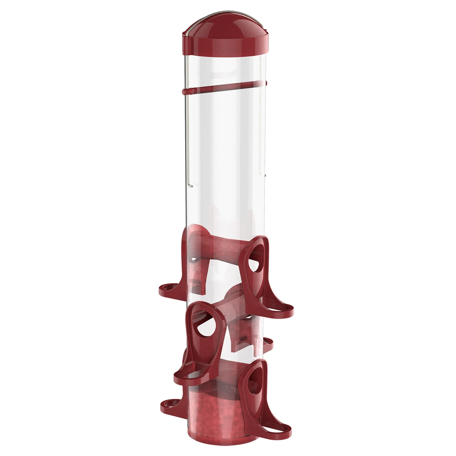 The More Birds Seed Tube feeder will attract finches, goldfinches, juncos and so many more. Its ergonomic U-shaped perches allow songbirds to comfortably feed and the 6 strategically placed ports provide feeding space for many birds to feed simultaneously. Each port has 3 feeding holes to maximize thistle distribution. The 1.3 lb Nyjer capacity feeder disassembles for convenient cleaning while the top slides up for no-spill fillings.