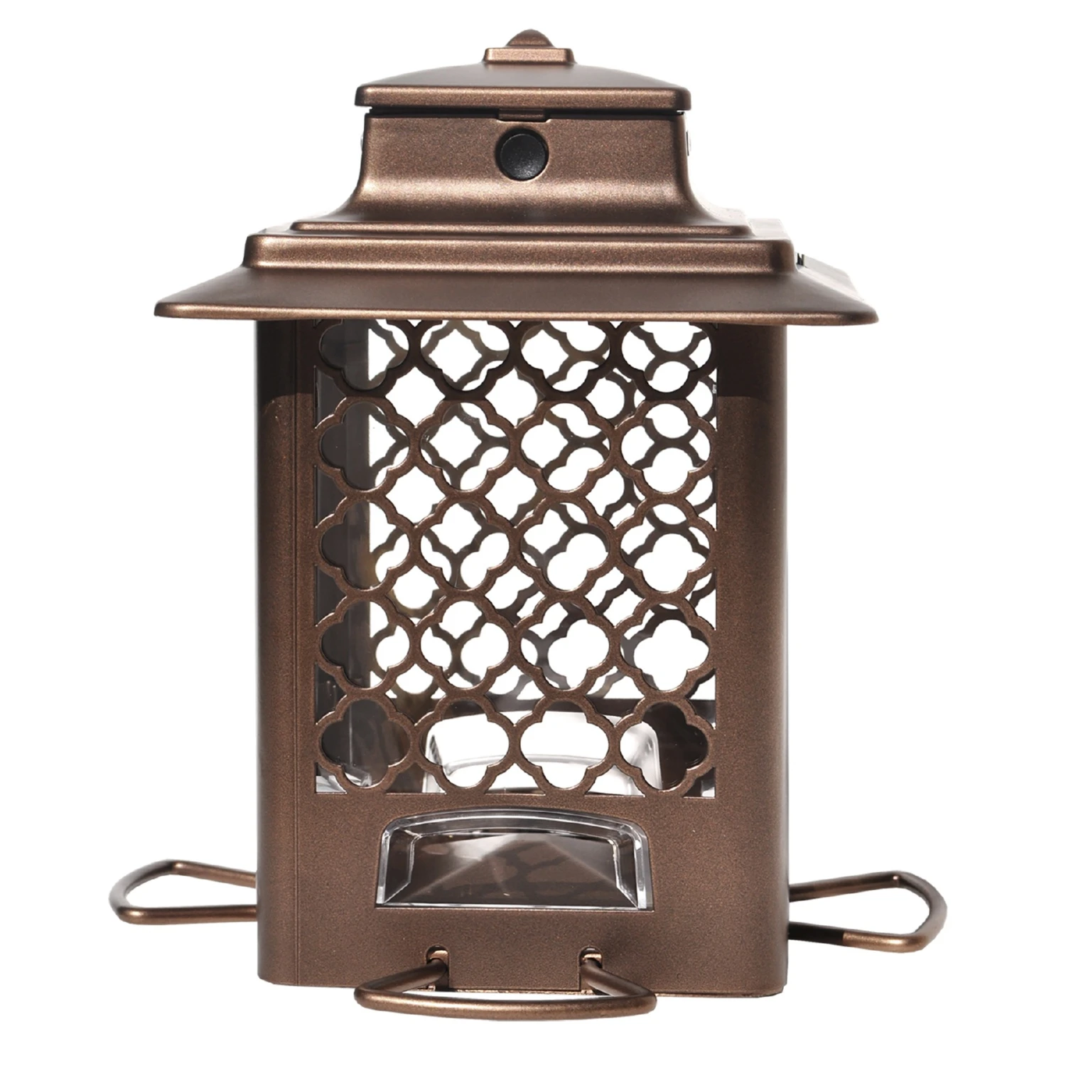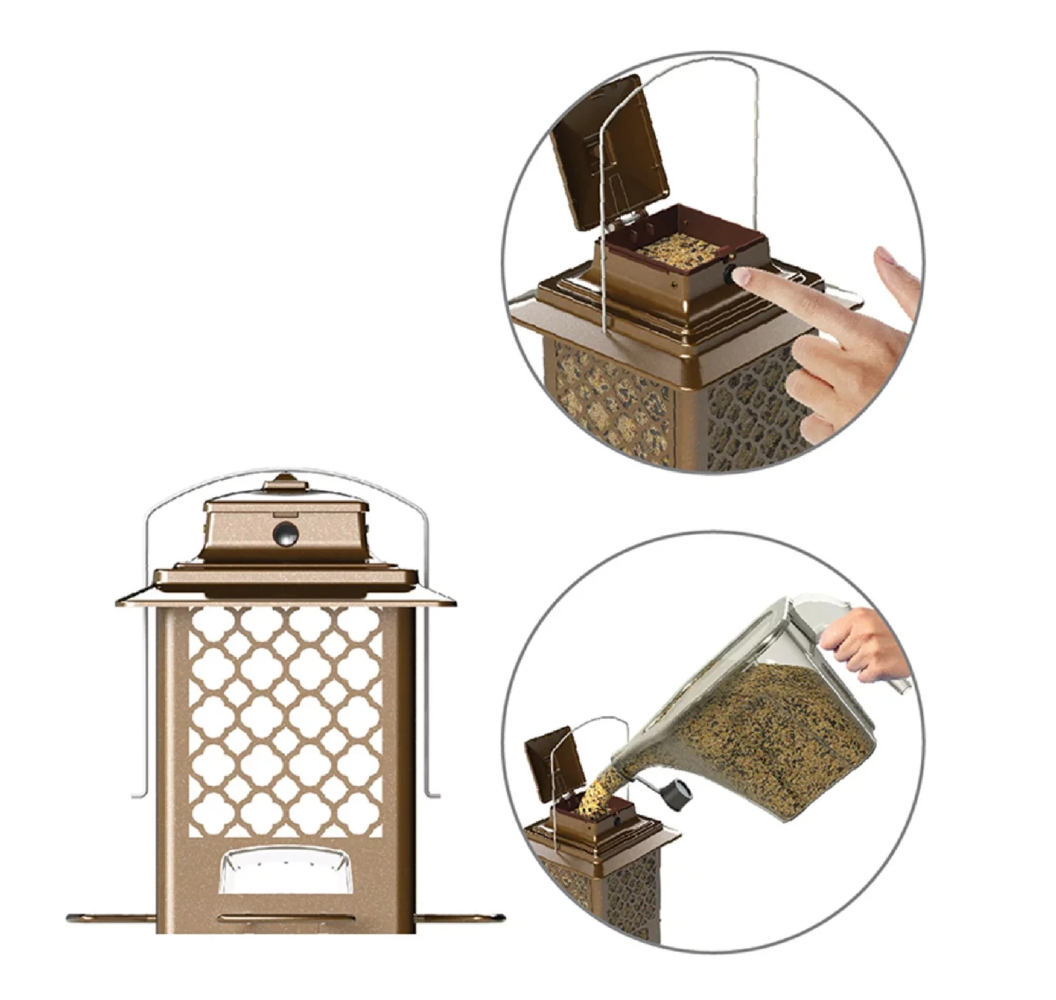 The More Birds® Metal Hopper Bird Feeder is making bird feeding easy™ with its SureFill No Spill™ features. Its spring-loaded, push-button top effortlessly opens with one touch, single-handedly taking away the bird feeder refill juggling act! Its durable metal hopper frame is resistant to squirrel chewing and coated in a beautiful matte bronze finish. Its elegant roof design and ornate metal detailing combine strength and style for a feeder like no other. With 4 large rounded perches to attract more birds and a generous 3.6 lb. seed capacity, the More Birds® Metal Hopper Bird Feeder keeps hungry birds happy and coming back for more!